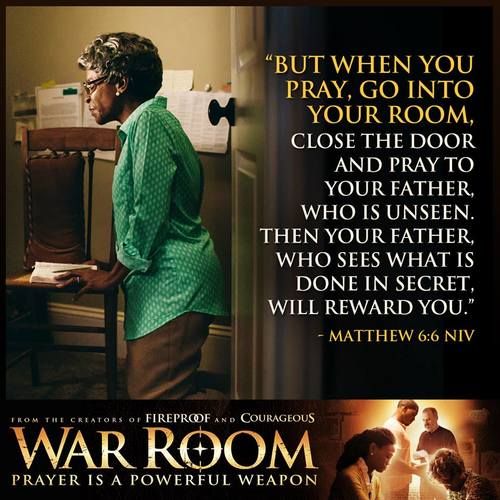 In the movie, the characters Ms. Clara and Elizabeth clear out their closets and pray. They create a quiet place to be alone with God. This is such a great example of making your relationship and prayer life a priority! Personally, I pray in my laundry room. It is an electronic free zone! No cell phones, no tablets, no TV, no distractions. Well, there's laundry to fold but who are we kidding. Ha! My point is, find your space. Find your quiet corner and make it your War Room. Carve out that spot for you and God.